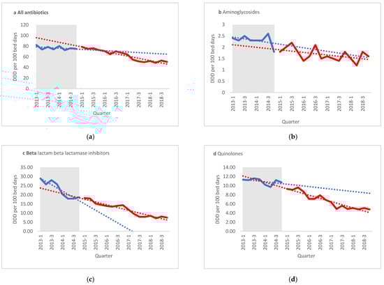 Interrupted time series analysis for quarterly defined daily doses (DDD)/100 bed days. (a) All antibiotics, (b) aminoglycosides, (c) beta lactam beta lactamase inhibitors, (d) quinolones. Shaded areas present pre-antibiotics stewardship intervention period. (e) LE—Level effect, PreASP—Pre-antibiotic stewardship intervention, Amox/clav—Amoxicillin clavulanate.