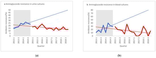 In blood cultures, no statistically significant differences in antibiotic resistance were noted between the pre-ASP and post-ASP periods, probably due to the relatively small sample size. However, ITS analysis demonstrated a significant change in both slopes of resistance to aminoglycosides and quinolones from a positive increasing rate of resistance pre-ASP to a negative slope or decreasing rate of resistance post-ASP, a change in slope of −4.04 (p = 0.012) for aminoglycosides and −4.41 (p = 0.01) for quinolones (Figure 2).