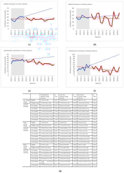Interrupted time series analysis for antibiotic-resistant E. coli rates in blood and urine cultures. Aminoglycoside resistance in urine cultures (a) and blood cultures (b). Beta lactam/beta lactamase inhibitor (BLBLI) resistance in urine cultures (c) and blood cultures (d). Quinolone resistance in urine cultures (e) and blood cultures (f). Shaded areas present pre-antibiotics stewardship intervention period. (g) LE—Level effect, PreASP—Pre-antibiotic stewardship intervention, Amox/clav—Amoxicillin clavulanate.