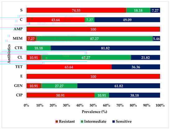 Antibiotic sensitivity test revealed that all 55 E. coli isolates were highly resistant to ampicillin and erythromycin. The isolates exhibited varying degrees of resistance to streptomycin (74.55%), tetracycline (63.64%), ciprofloxacin (50.91%), and chloramphenicol (43.64%). The isolates were highly or intermediately sensitive to ceftriaxone, meropenem, gentamicin, and colistin. The antibiogram profiles of the isolated E. coli are presented in Figure 1.
