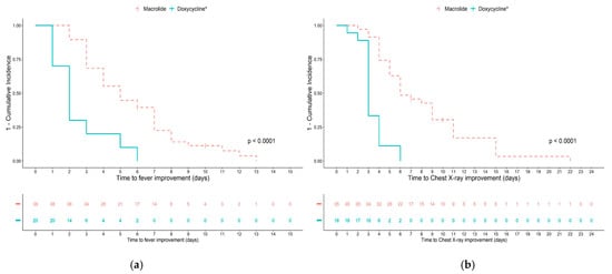 Cumulative incidence analysis of fever and chest X-ray improvement according to antibiotic group in children with macrolide-resistant Mycoplasma pneumoniae pneumonia. (a) Time to resolution of fever; (b) time to chest X-ray improvement in children treated with macrolides only or doxycycline (* including macrolides changed to doxycycline and doxycycline only).