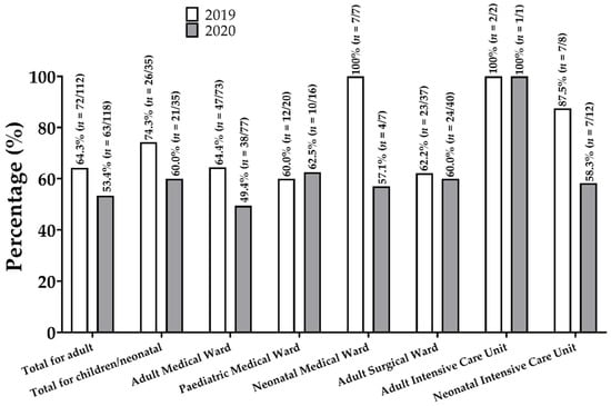 The prevalence of antimicrobial prescriptions for hospital inpatients was 66.7% (n = 98/147) and 54.9% (n = 84/153) in July 2019 and January 2020, respectively. In July 2019, the antimicrobial prevalence was 64.3% (n = 72/112) among adults and 74.3% (n = 26/35) among children and neonates. On the other hand, the antimicrobial prevalence in January 2020 was 53.4% (n = 63/118) among adults and 60.0% (n = 21/35) among children and neonates. Within the various wards considered, there were differences in the prevalence of the use of antimicrobials in the two surveys. For example, while the prevalence was 64.4% (n = 47/73) in the adult medical ward in the first survey, the prevalence reduced to 49.4% (n = 38/77) in the second survey. In addition, while the prevalence in the neonatal intensive care unit was 87.5% (n = 7/8) in 2019, the prevalence declined to 58.3% (n = 7/12) in 2020. In summary, the highest prevalence of antimicrobial use across the two periods was observed in the neonatal medical ward (100%, n = 7/7) in the 2019 survey and the adult intensive care unit in both 2019 and 2020 (100%, n = 2/2; 100, n = 1/1). The details on the prevalence in the surveyed wards are illustrated in Figure 1.