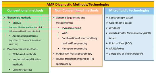 Although new time-saving technologies have been introduced to obtain antimicrobial resistance data, the classic, conventional technologies are still being used. These mainly include culture-based and molecular-based approaches. More recently, microscopy-based and spectrometry-based approaches have also been incorporated in the tools for developing diagnostics.