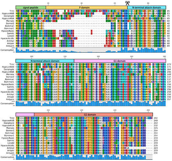 Alignment of attacin amino acid sequences from Lepidoptera obtained by Clustal ω. The predicted signal peptide and the different domains are highlighted above the sequences, together with the RXXR motif (indicated as cut symbol). Accession numbers: Trichoplusia ni U46130; Hyphantria cunea Attacin B ABL63641; Danaus plexippus plexippus OWR54405; Hyphantria cunea Attacin A AAD09288; Manduca sexta AAY82587; Bombyx mori 2 Q26431; Bombyx mandarina XP_028041931; Bombyx mori 1 ADB08384; Hyalophora cecropia Basic CAA44179; Samia ricini BAB69462; Lonomia obliqua Q5MGE6; Hyalophora cecropia Acidic CAA40886; Antheraea mylitta ABG72695; Antheraea pernyi ACB45562; Antheraea yamamai AFS30776. Sequence conservation is shown as a histogram below the multiple sequence alignment; Att = Attacin.