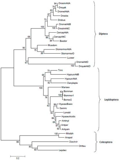 Phylogenetic tree of attacins from different insect orders obtained using the MEGA 6.0 program. The percentage of replicate trees in which the associated taxa clustered together in the bootstrap test (10.000 replicates) is shown next to the branches. The number 0.2 represents the genetic distance. Accession numbers: Drosophila simulans Attacin A EDX07123; Drosophila yakuba EDW91058; Drosophila melanogaster Attacin A Z46893; Drosophila obscura XP_022225780; Drosophila busckii ALC41796; Drosophila melanogaster Attacin B AAL23652; Drosophila simulans Attacin C AAP69835; Ceratitis capitata Attacin A XP004517761; Ceratitis capitata Attacin C XP004517762; Bactrocera dorsalis KJ598077; Musca domestica AAU08203; Glossina morsitans morsitans Attacin A AAL34113; Glossina morsitans morsitans Attacin D CAP78962; Lucilia sericata HM243534; Drosophila melanogaster Attacin D AAF55446; Drosophila yakuba Attacin D EDW95807; Microdera dzhungarica AHH34162; Anatolica polita APX53001; Diabrotica virgifera virgifera AHB11276; Onthophagus taurus XP_022912795; Leptinotarsa decemlineata XP_023024624. For the Lepidoptera accession numbers, see Figure 1. Att = Attacin.