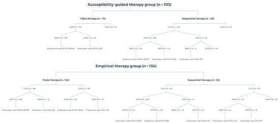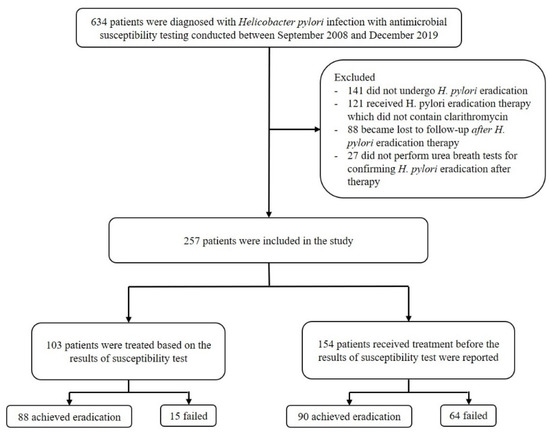 From September 2008 to December 2019, a total of 634 patients were diagnosed with H. pylori infection and underwent upper gastrointestinal endoscopies to obtain gastric mucosal tissues cultured for antimicrobial susceptibility tests before the initiation of eradication therapy at the Asan Medical Center, Seoul, Korea. In total, 377 patients were excluded (141 did not undergo H. pylori eradication therapy, 121 received H. pylori eradication therapy that did not contain clarithromycin, 88 became lost to follow-up after eradication therapy, and 27 did not perform urea breath tests after completing therapy). Finally, 257 patients who received clarithromycin-containing regimens and underwent urea breath tests for confirming eradication at least four weeks after completing therapy were included in the study. They were divided into two groups: the susceptibility-guided therapy group (n = 103), who were treated based on the results of susceptibility testing (for example, when the strains were resistant to clarithromycin, the patient did not receive clarithromycin-containing regimen), and the empirical therapy group (n = 154), who were treated before the results of the susceptibility test were reported (Figure 1).