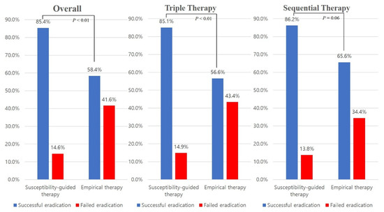 In this study, by retrospectively analyzing patient medical records, we compared susceptibility-guided therapy with empirical therapy as a first-line treatment containing clarithromycin for H. pylori eradication and investigated the eradication rate according to antimicrobial susceptibility testing.