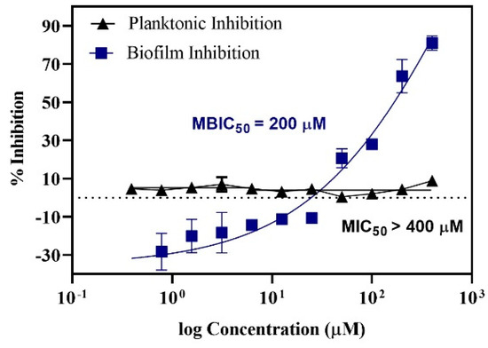 Dose response curve representing the action of Baicalein on S. mutans. MBIC50 (Minimum Biofilm Inhibitory Concentration) = 200 μM; MIC50 (Minimum Inhibitory Concentration) > 400 μM.