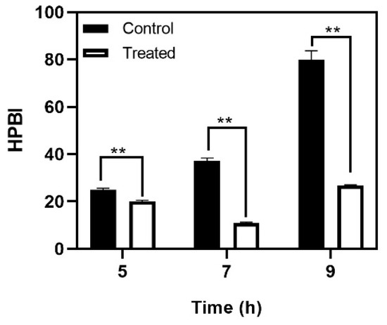Effect of baicalein on S. mutans cell surface hydrophobicity. Student t-test was used for analysing significance and p < 0.05 was considered significant. ** denotes p ≤ 0.05.