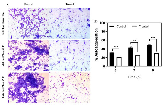 Autoaggregation, a phenomenon where bacterial cells of the same species secrete specific polymers to interact and aggregate, is enhanced by hydrophobic interactions amongst cells [25], and is considered an initial step in biofilm formation. Baicalein treatment showed a marked reduction in autoaggregation at all the three time points: Early log phase (5th hour), mid-log phase (7th hour) and late log phase (9th hour) (Figure 4). The differences were more distinct in the late log phase where baicalein treatment reduced the aggregation by at least 20% relative to the control. Light microscopic images clearly demonstrated the inhibition of autoaggregation by baicalein at different time points considered (Figure 4A).