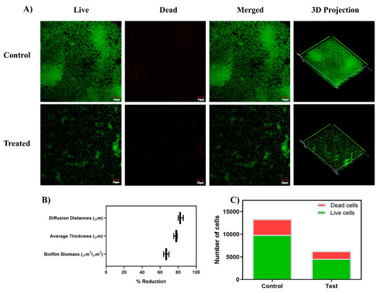 (A) CLSM (Confocal Laser Scanning Microscopy) micrographs illustrating the effect on the sub-inhibitory concentration of baicalein (200 µM) on biofilm architecture and viability of the biofilm cells through Live/Dead staining. Baicalein treated cell cultures show sparing green color cells with no confluent mass, indicating inhibition of biofilm formation. (B) COMSTAT analysis of the CLSM images revealed a reduction in the biofilm biomass, average thickness, and diffusion distances in the baicalein treated biofilms compared to the untreated control. (C) ImageJ analysis shows the proportion of viable cells in the biofilm formed with baicalein treatment at the concentration of 200 µM (MBIC50).