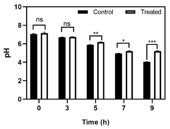 Acid production serves two roles in the caries process. Its primary role is to maintain an acidic environment where the non-aciduric microbes cannot survive, contributing to dysbiosis. Secondly, acid production is also responsible for the acidic microenvironments within the biofilm, resulting in demineralization of the contacting tooth surface, leading to cavity formation [27,28]. Our results showed that baicalein did not allow the pH to drop below 5.2–5.5 which is considered the critical pH for enamel demineralization [29]. The pH of Baicalein solution in BHI media and supplemented with 20 mM sucrose was maintained at pH 7.4 ± 0.1 and in the sterile distilled water was maintained at pH 6.4 ± 0.1. Baicalein treated groups demonstrated a relative increase in pH from the 5th hour of incubation. The pH of ~5.2 was maintained until 9 h of treatment, while the pH dropped to ~4 for the control group (Figure 7).