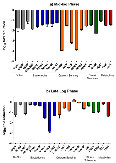 - Shanmugam, K.; Sarveswari, H.B.; Udayashankar, A.; Swamy, S.S.; Pudipeddi, A.; Shanmugam, T.; Solomon, A.P.; Neelakantan, P. Guardian genes ensuring subsistence of oral Streptococcus mutans. Crit. Rev. Microbiol. 2020, 46, 475–491. [Google Scholar] [CrossRef]