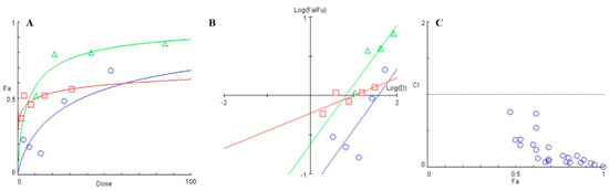 (A) Dose-response curve plotted between the fraction affected (fa) of biofilm formed and drug dose (μg/mL). (B) Median effect plot depicting the logarithmic transform of the ratio of the fraction affected (fa) and fraction unaffected (fu) as a function of the logarithmic transform of the dosage of individual treatment- (