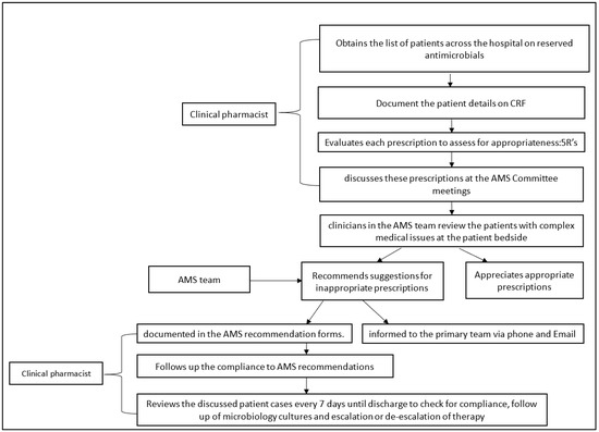 The AMS team initially audited three reserved antimicrobials, based on the consumption data, namely colistin, polymyxin B and tigecycline, which over time expanded to a total of 14 reserved antimicrobials. The workflow of the AMS team has been outlined in Figure 1.