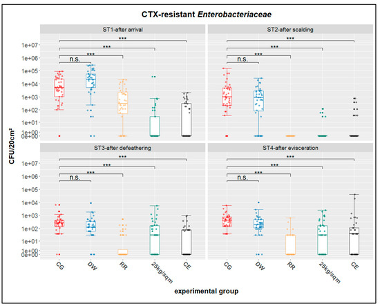 Distribution and statistics for CTX-resistant Enterobacteriaceae; ST1-after arrival, ST2-after scalding, ST3-after defeathering, ST4-after evisceration; CG-control group, DW-drinking water supplement, RR-slow growing breed Rowan × Ranger, 25kg/sqm-reduced stocking density, CE-competitive exclusion; results of nonparametric multiple contrast test are shown as: n.s.—not significant, ***—p < 0.001. The lower and upper hinges of the boxes correspond to the first and third quartiles (the 25th and 75th percentiles). The line in the box between the lower and upper hinges corresponds to the median. The upper whisker extends from the upper hinge to the largest value but no further than 1.5 × IQR from the hinge (where IQR is the inter-quartile range, or distance between the first and third quartiles). The lower whisker extends from the lower hinge to the smallest value but at most 1.5 × IQR of the hinge.