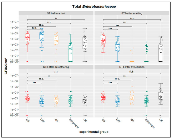Distributions and statistics for total Enterobacteriaceae; ST1-after arrival, ST2-after scalding, ST3-after defeathering, ST4-after evisceration; CG-control group, DW-drinking water supplement, RR-slow growing breed Rowan × Ranger, 25 kg/sqm-reduced stocking density, CE-competitive exclusion; results of nonparametric multiple contrast test are shown as: n.s.—not significant, **—p < 0.01, ***—p < 0.001. The lower and upper hinges of the boxes correspond to the first and third quartiles (the 25th and 75th percentiles). The line in the box between lower and upper hinge corresponds to the median. The upper whisker extends from the upper hinge to the largest value but no further than 1.5 × IQR from the hinge (where IQR is the inter-quartile range, or distance between the first and third quartiles). The lower whisker extends from the lower hinge to the smallest value but at most 1.5 × IQR of the hinge.