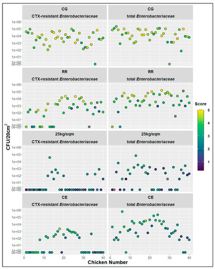 Chicken vise distribution of the total scoring values related to measures of bacterial counts for CTX-resistant and total Enterobacteriaceae, CG-control group, RR-slow growing breed Rowan × Ranger, 25 kg/sqm-reduced stocking density, CE-competitive exclusion; grey dots—not scored.