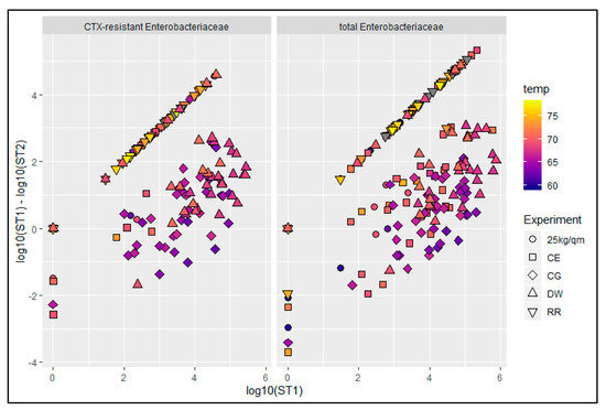 Plot of the log10 values of the initial concentration of CTX-resistant and total Enterobacteriaceae at station 1 (ST1) against the reduction of the bacterial counts after scalding (ST1-ST2). Scalding temperatures in °C (temp) are displayed in a color scale; CG-control group, DW-drinking water supplement, RR-slow growing breed Rowan × Ranger, 25 kg/sqm-reduced stocking density, CE-competitive exclusion; grey—temperature not determined.