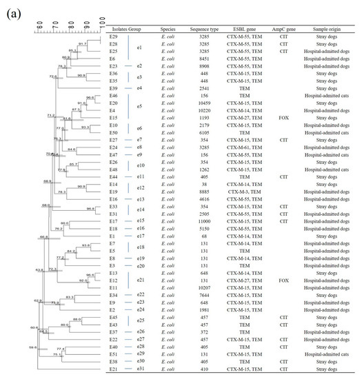 - Tamang, M.D.; Nam, H.-M.; Jang, G.-C.; Kim, S.-R.; Chae, M.H.; Jung, S.-C.; Byun, J.-W.; Park, Y.H.; Lim, S.-K. Molecular characterization of extended-spectrum-β-lactamase-producing and plasmid-mediated AmpC β-lactamase-producing Escherichia coli isolated from stray dogs in South Korea. Antimicrob. Agents Chemother. 2012, 56, 2705–2712. [Google Scholar] [CrossRef] [PubMed]