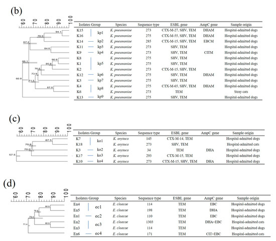 - Hong, J.S.; Song, W.; Park, H.-M.; Oh, J.-Y.; Chae, J.-C.; Shin, S.; Jeong, S.H. Clonal spread of extended-spectrum cephalosporin-resistant Enterobacteriaceae between companion animals and humans in South Korea. Front. Microbiol. 2019, 10, 1371. [Google Scholar] [CrossRef]