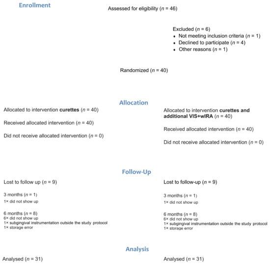 A total of 46 patients were pre-examined for the study, of which 40 patients were treated with the described protocol. Six patients had to be excluded because of not appearing after successful pre-treatment/information, incorrect diagnosis in the recruitment phase, and extraction therapy by non-participating dentists. Out of 40 patients treated with VIS + wIRA, a total of 39 could be re-examined after 3 months. One patient had to be excluded owing to “repeated absence at the follow-up appointment”. After 6 months, 31 patients could be re-examined. Seven did not appear for the follow-up appointment. One patient received a subgingival instrumentation outside the study protocol in the meantime and one patient’s data had to be excluded because of a storage error (Figure 1).