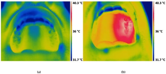 The temperature measurement was carried out on a total of 37 test participants. Three patients had to be excluded because of technical problems with the temperature probe. The mean measured sublingual temperature was 36.13 °C. Furthermore, the temperatures in the control sextants and in the sextants treated with VIS + wIRA were measured before and after 20 min of VIS + wIRA treatment (Table 3). Temperature in the exposed sextant increased significantly (3.73 °C) compared with the control sextant (0.68 °C). Additional infrared sample images were taken before and after the VIS + wIRA treatment (Figure 2). Here, it became clear that the VIS + wIRA treatment mainly affects the treated sextant, but the remaining facial area including adjacent structures is also warmed up.