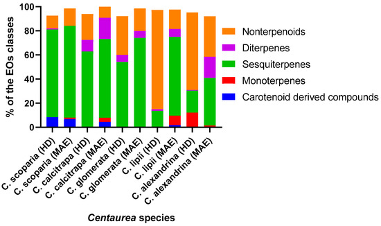 Two EOs derived from C. calcitrapa revealed the abundance of terpenoids with concentrations of 72.34 and 82.87% alongside with nonterpenoids (21.65 and 9.23%) (Figure 1). An amount of 4.48% of EO extracted by MW were characterized as carotenoid-derived compounds, while there was a complete absence of these compounds in HD-EO (Figure 1).