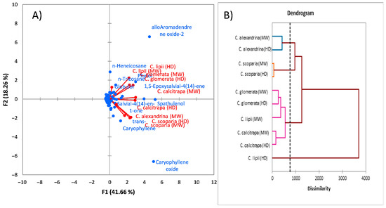 (A) Principal component analysis (PCA); (B) Agglomerative hierarchical clustering (AHC) of the five Centaurea species, C. scoparia, C. calcitrapa, C. glomerata, C. lipii and C. alexandrina, based on the major chemical compounds of the extracted EOs by hydrodistillation and microwave.