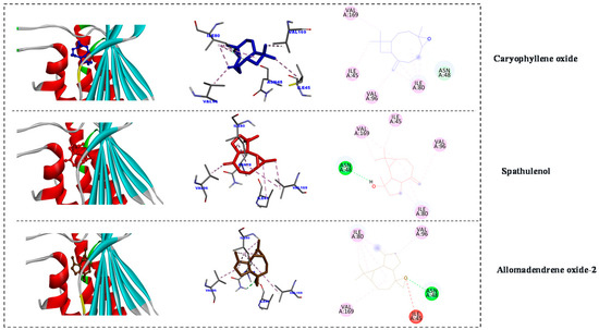The advantages of computer-aided drug discovery via structural studying against targeted enzymes as well as drug repurposing have led them to become an essential program for major pharmaceutical companies, owing to the speed and lower costs of their processes. Recently, DNA gyrases have become an attractive target for anticancer and antibacterial research as they are essential enzymes for cell survival in prokaryotes. Today, searching for new inhibitors of the ATP-binding pocket of Gyrase B enzyme (PDB code: 4GEE) is attracting the attention of pharmaceutical industries [51]. Alloaromadendrene oxide-2 and spathulenol showed the best binding affinity (−6.98 and −6.88 kcal mol−1), while caryophyllene oxide showed slightly less binding affinity (−6.35 kcal mol−1). Additionally, the inhibition constant (pKi) for the tested metabolites was as follows: alloaromadendrene oxide-2 (7.63 µM), spathulenol (9.03 µM) and caryophyllene oxide (22.34 µM). The positive control (Thiophenicol) binding affinity was −6.97 kcal mol−1 and the inhibition constant (pKi) was 7.73 µM (Figure 3).