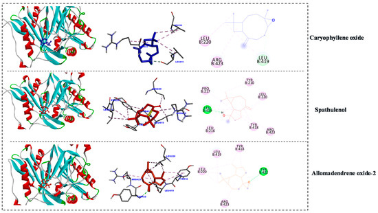The chemical structures of EO Major metabolites, caryophyllene oxide, spathulenol, and allomadendrene oxide-2, were downloaded as SDF files from the PubChem database (https://pubchem.ncbi.nlm.nih.gov/ (accessed on 29 January 2021)), followed by converting these files to PDB format via the free software Avogadro (https://avogadro.cc/ (accessed on 29 January 2021)). The protein crystal structures for 4GEE (antimicrobial) and 1iyk (anti-fungal) were downloaded from the protein databank (https://www.rcsb.org/ (accessed on 29 January 2021)) using our previously published molecular docking protocol [58].