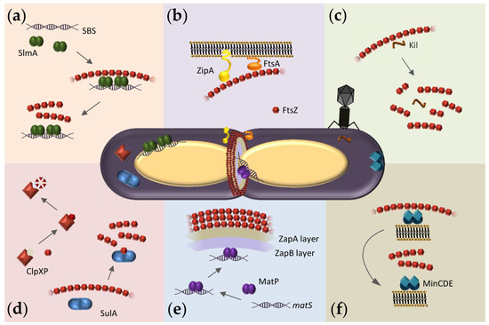 Overview of FtsZ hetero-associations in E. coli as possible targets for antibacterials. At the center, representation of a dividing E. coli cell showing the Z-ring assembled at midcell and FtsZ macromolecular interaction systems. (a) Scheme of the nucleoid occlusion system mediated by SlmA. SlmA bound to specific SBS sequences within the bacterial chromosome, except in the Ter macrodomain, inhibits FtsZ polymerization, thus protecting the chromosome from aberrant scission. (b) The Z-ring is attached to the inner membrane through the protein anchors ZipA and FtsA. (c) Interaction of FtsZ with the bacteriophage λ Kil peptide disrupts FtsZ polymers, resulting in shorter oligomers of variable size. (d) SulA protein, induced by the SOS response, transiently inhibits cell division during DNA repair by sequestering FtsZ monomers. ClpXP protease degrades FtsZ, modulating polymer dynamics and Z-ring formation. (e) Scheme of the Ter- linkage that contributes to Z-ring positioning at midcell. From the membrane inwards, FtsZ interacts with ZapA, ZapB, and MatP. MatP is bound to matS sequences located in the chromosomal Ter macrodomain. (f) The pole-to-pole oscillatory waves of the MinCDE system on the cytoplasmic membrane prevent FtsZ polymerization at the cell poles.