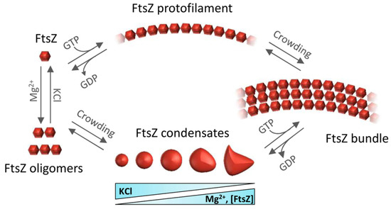 Overview of the assemblies formed by FtsZ self-association. FtsZ-GDP monomers form oligomers favored by magnesium and low salt. Under crowding conditions, FtsZ-GDP reversibly phase-separates into biomolecular condensates whose number and size depend on FtsZ, KCl, and Mg2+ concentrations. GTP addition triggers FtsZ polymerization whether the protein is in oligomers or in condensates. Macromolecular crowding favors the lateral association of single stranded filaments to form bundles.