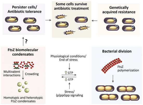 Hypothetical role of FtsZ biomolecular condensation in bacterial resistance to antibiotic treatment. Bacteria can survive antibiotics through a subpopulation of transiently tolerant persister cells or by genetically acquired resistance. The mechanisms leading to formation of persisters remain unclear, but the biomolecular condensates formed by FtsZ, by itself or with partners, may play a role. Homotypic and heterotypic phase-separated condensates of FtsZ-GDP are favored by multivalent interactions and crowding in cells. Condensates would be also favored in situations with low GTP levels, such as stress conditions leading to the activation of (p)ppGpp signaling after antibiotic exposure. The reversible conversion of FtsZ condensates into FtsZ polymers, triggered by GTP, would explain how the persister cells resume growth after stress conditions are over and normal GTP levels are restored.