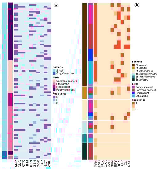 Distribution and clustering of Escherichia coli, Salmonella typhimurium, and Staphylococcus isolates recovered from different species of migratory wild birds around the Al-Asfar Lake. (a) Heat map representation of antimicrobial-resistant profiles of the 90 Escherichia coli and 5 Salmonella typhimurium isolates. (b) Heat map representation of antimicrobial-resistant profiles of the 37 Staphylococcus isolates.