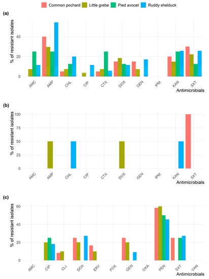 Frequency of antimicrobial resistance of (a) Escherichia coli; (b) Salmonella typhimurium; and (c) Staphylococcus spp. recovered from different species of migratory wild birds around the Al-Asfar Lake.