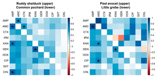 However, no significant difference (p > 0.05) was detected between resistance rates of E. coli isolated from different species of migratory wild birds. Many significant pairwise correlations were detected between minimum inhibitory concentration values for different antimicrobials against E. coli isolated from different migratory wild bird species (Figure 3). The strongest significant (p < 0.001) correlation coefficients were detected between AMP and AMC (r = 0.62; Ruddy shelduck), Amp and CHL (r = 0.77; Common pochard), and AMP and AMC (r = 0.86; Little grebe).
