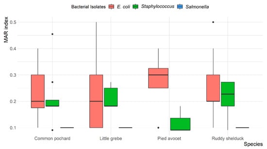 Overall, MDR was observed in 13 (14.4%) E. coli and 7 (18.9%) Staphylococcus spp. isolates, with resistance up to four different antibiotic classes. None of the S. typhimurium isolates were MDR. The mean multiple antibiotic resistance (MAR) index was 0.24 (ranged from 0.1 to 0.5) for E. coli, 0.1 for S. typhimurium, and 0.20 (ranged from 0.09 to 0.45) for Staphylococcus spp. Most E. coli (78.6%) and Staphylococcus spp. (69.6%) isolates showed a MAR index of >0.2. However, all S. typhimurium (100%) showed a MAR index of <0.2. The variation between MAR index of E. coli, S. typhimurium, and Staphylococcus spp. recovered from different species of migratory wild birds is presented in Figure 4.
