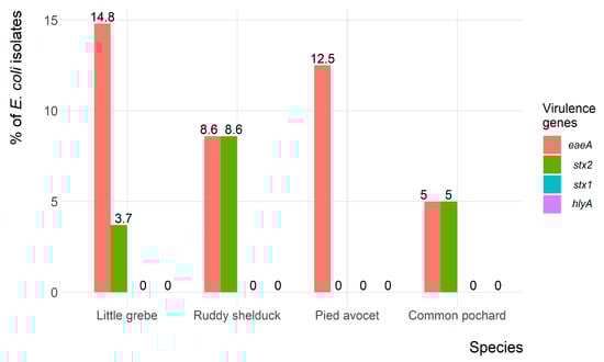 In the present study, the eaeA and stx2 virulence-associated genes were identified in 10%, and 5.6% of the E. coli isolates, respectively. This result was consistent with Kobayashi et al. [43], who identified eaeA and stx2 in Japan. However, the incidence of the eaeA and stx2 reported in the present study was higher than the 2.3% reported in wild brides in Iran [44]. Several studies have reported the association of eaeA and stx2 genes, which indicated the importance of testing eaeA positive isolates for the presence of the stx2 gene [44,45]. The hlyA and stx1 genes were not identified in any E. coli recovered in the present study. This result contrasts with a recent study carried out in wild birds in Central Italy, which detected 3.3% and 8.3% of birds were positive for hlyA and stx1, respectively [46].