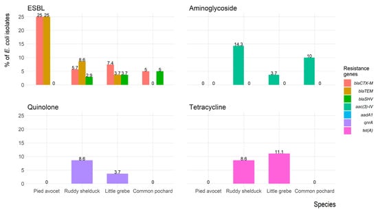 E. coli frequently used as an indicator for the microbiological quality of water [11,35]. Data in the present study showed a higher incidence of E. coli recovery from waterfowl (Common pochard, Little grebe and Ruddy shelduck) comparing to Pied avocet that is relatively less dependent on water. The same finding extends to S. typhimurium and Staphylococcus recovery. In the same context, 21%, 42%, and 37% of mixed infection cases were recovered from Ruddy shelduck, Common pochard, and little grebe, respectively, whereas no mixed infections were detected in Pied avocet. Previous studies in Saudi Arabia mainly addressed E. coli AMR in resident wild birds [29,36].
