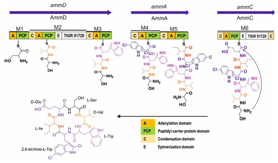 A tryptophan halogenase encodes by ammB, which shows high homology (77% identity, 88% similarity) to FADH2-dependent halogenase from Micromonospora sp. GMKU326. This halogenase in ammB is most likely responsible for generating the 2,6-dichloro-tryptophan.