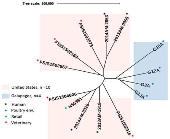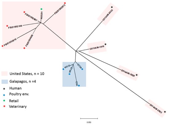 3.1. Potentially Pathogenic Clones of NTS Are Present in Poultry Farms in the Galapagos