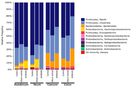 Microbiome of intestine of pigs is dominated by Firmicutes, followed by Proteobacteria in the small intestine and Bacteroidetes in the large intestine [53,54,55,56]. At the class level, dominant classes of each phylum are Bacilli and Clostridia (Firmicutes), Bacteroidia (Bacteroidetes), and Gammaproteobacteria (Proteobacteria). Our results are consistent with these previous findings, especially at the phylum level. Other studies had shown that some Lactobacillus species play an important role in intestinal health of piglets by influencing intestinal physiology, regulating the immune system, and balancing the intestinal ecology of the host [57,58]. In our experiment, in caecum and colon, piglets supplemented with Allium extract showed similar levels of Bacilli versus control group, mainly due to the genus Lactobacillus. However, antibiotic group showed lower proportion of Lactobacillus, especially in the colon, showing that colistin and ZnO would have an effect on Lactobacillus depletion, whereas the genus Prevotella had an increase occupying its niche. This decrease in Lactobacillus abundance in colistin and ZnO piglets may be related to a depletion in carbohydrate levels in distal parts of the gut. In vitro studies have demonstrated that shifts in pig gut microbiome composition can be produced by changes in substrate structure [59]. Different Allium extracts produce changes in the physiology and histology of the gut of animals. In broilers, onion powder increased length, width, and surface area of intestinal villus [60]. In piglets, aged garlic extract improved body weight, the morphology of intestinal villi, and non-specific immune response [29]. Other studies using Allium extract in growing-finishing pigs showed an increase in productive parameters and an increase of short-chain fatty acids (SCFA) in feces, which is related to high Lactobacillus abundance in distal gut [61]. These changes may suggest that Allium extracts produce changes in the availability of some substrates necessary for the growth of beneficial bacteria. However, an in vitro study showed that PTSO extracted from Allium plants have antimicrobial activity against lactobacilli, bifidobacteria, Bacteroides, and Clostridia, and strongly reduce enterobacteria and coliforms in swine microbiota [30]. Whether PTSO and Allium extracts affect bacterial community directly or indirectly by change the substrate availability deserve future research.