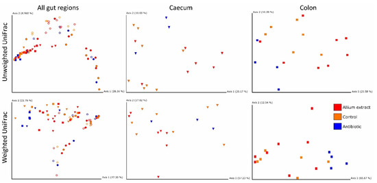 When we studied the effect of Treatment within each gut region, significant differences appeared at the. caecum level with Unweighted UniFrac (Figure 3) and at the colon level with both Unweighted and Weighted UniFrac (Figure 3). Antibiotic samples grouped in a cluster separated from control and Allium extract samples. Therefore, our treatment affected mainly to large intestine regions (Table 3).