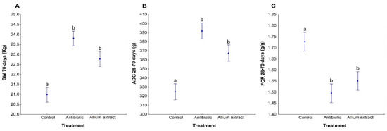 Average ± standard error of the mean of the Body Weight (BW) at 70 days of life (A), Average Daily Gain (ADG) (B), and Feed Conversion Ratio (FCR) (C) from 28 to 70 days of life of weaned piglets fed with control diet or antibiotic or Allium extract supplemented diets. Bars with different letter denote significant differences in treatment (LSD Posthoc test; p < 0.05).
