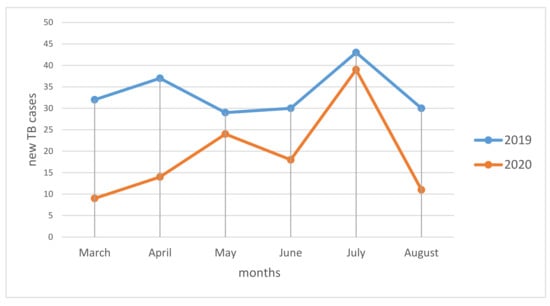 A retrospective data collection and evaluation was conducted to include all the patients hospitalized for TB at INMI from 9 March to 31 August 2020 (lockdown period and three months thereafter). For the purpose of the study data from patients hospitalized in the same period of 2019 were also collected. Data have been extracted from the local TB database approved by L. Spallanzani Institute Ethics Committee (Decision No. 12/2015). All patients provided written informed consent to the utilization of anonymized clinical data. The inclusion criteria were as follows: diagnosis of tuberculosis according to WHO guidelines, age above 18 years [32]. Data collection included patient’s socio-demographic characteristics (i.e., sex, marital status, age, occupational status, education, nationality), risk factors for TB (diabetes, chronic renal failure, malignances, being under immunosuppressive therapy, diabetes, renal failure, HIV infection, previous TB and smoking habit), clinical and microbiological characteristics (symptoms, BMI, drug resistance pattern, concurrent extrapulmonary TB, functional respiratory impairment).