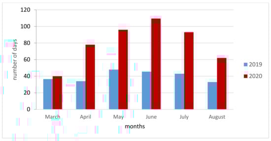 A significant increase in total diagnostic delay (TD, time interval between the onset of symptoms and start of TB treatment) was observed. The median patient delay (PD, period from the onset of the first symptom(s) related to pulmonary TB to the first medical consultation) was 75 days (IQR: 40–100) in 2020 compared to 30 days (IQR: 10–60) in 2019 (p < 0.01). The delay by month of admission in 2020 was higher for all the months considered, except for March, compared with the same months of 2019 (Figure 2). The healthcare system (HSD, the time interval between the first medical consultation and start of TB treatment) delay was 5 days (IQR: 3–14) in 2020 versus 4 (IQR: 2–10) in 2019; the total delay (PD+HSD) was 90 days (IQR: 58–107) and 38 (IQR: 22–69), in 2020 and in 2019, respectively (p < 0.01) (Table 3).