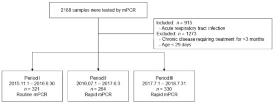 We conducted a retrospective cohort study of children hospitalized at Yeungnam University Hospital from November 2015 to August 2018, who underwent testing for respiratory pathogens either in the ED prior to admission or within the first 2 days of hospitalization. Virus tests were performed on patients with fever accompanied by diseases of the respiratory system, such as URI, bronchiolitis, pneumonia, croup, and tonsillitis. We excluded patients with chronic disease requiring treatment for more than 3 months and infants under 29 days of age. From November 2015 to June 2016 (period I), routine mPCR testing was performed on nasopharyngeal swabs by using the AnyplexTM II RV16 detection kit (RV16; Seegene, Seoul, Korea). From July 2016 to July 2018 (periods II and III), newly adopted mPCR testing was performed on nasopharyngeal swabs by using the FA-RP (BioFire Diagnostics, Inc., Salt Lake City, UT, USA). We divided this period into periods II (2016.7.1 to 2017.6.30) and III (2017.7.1 to 2018.7.31). After the introduction of the rapid mPCR test method, we conducted a study by dividing the period by one year to check whether medical practices such as antibiotic prescription and hospital stay changed.
