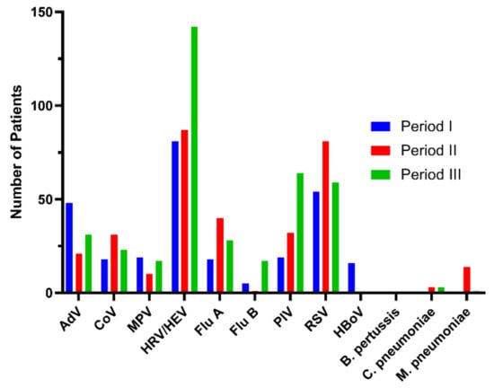 Human rhinovirus (HRV) was the virus most frequently detected during period I (n = 72, 21.6%), followed by respiratory syncytial virus (RSV) (n = 53, 15.9%) and adenovirus (AdV) (n = 48, 14.4%). During period III, HRV and human enterovirus (HEV) were most frequently detected (n = 156, 42.0%), followed by RSV (59, 16%) and parainfluenza viruses (PIV) (n = 50, 13%) (Table 3, Figure 2).
