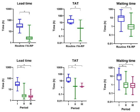 Lead time, waiting time, and TAT were shorter in the FA-RP group (p < 0.001) (Figure 3).